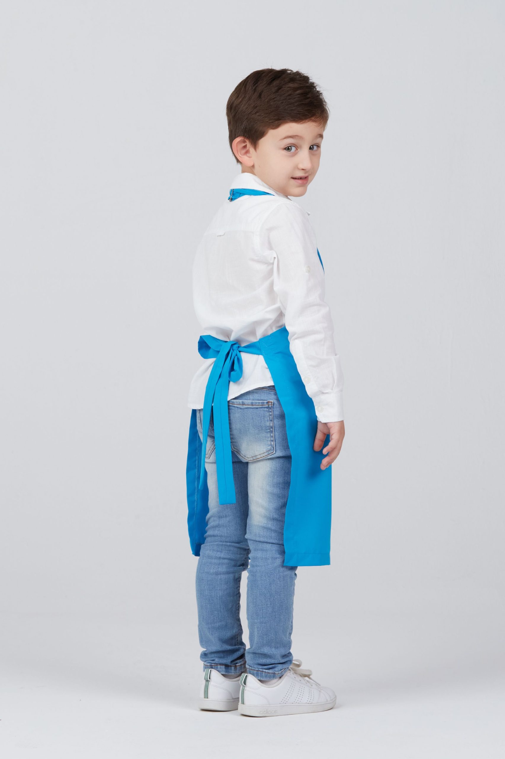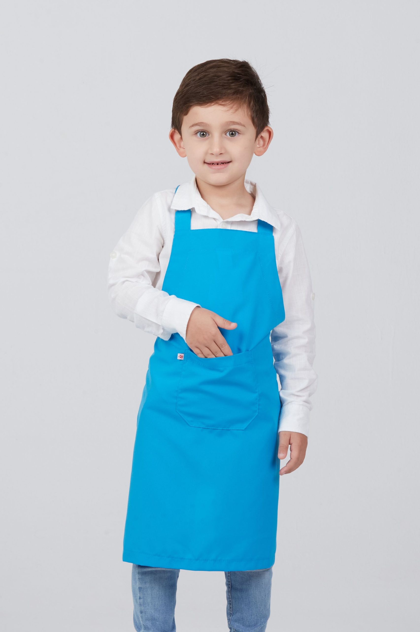 Avental curto infantil seletel com alças ajustáveis, amarração nas costas e bolso frontal.