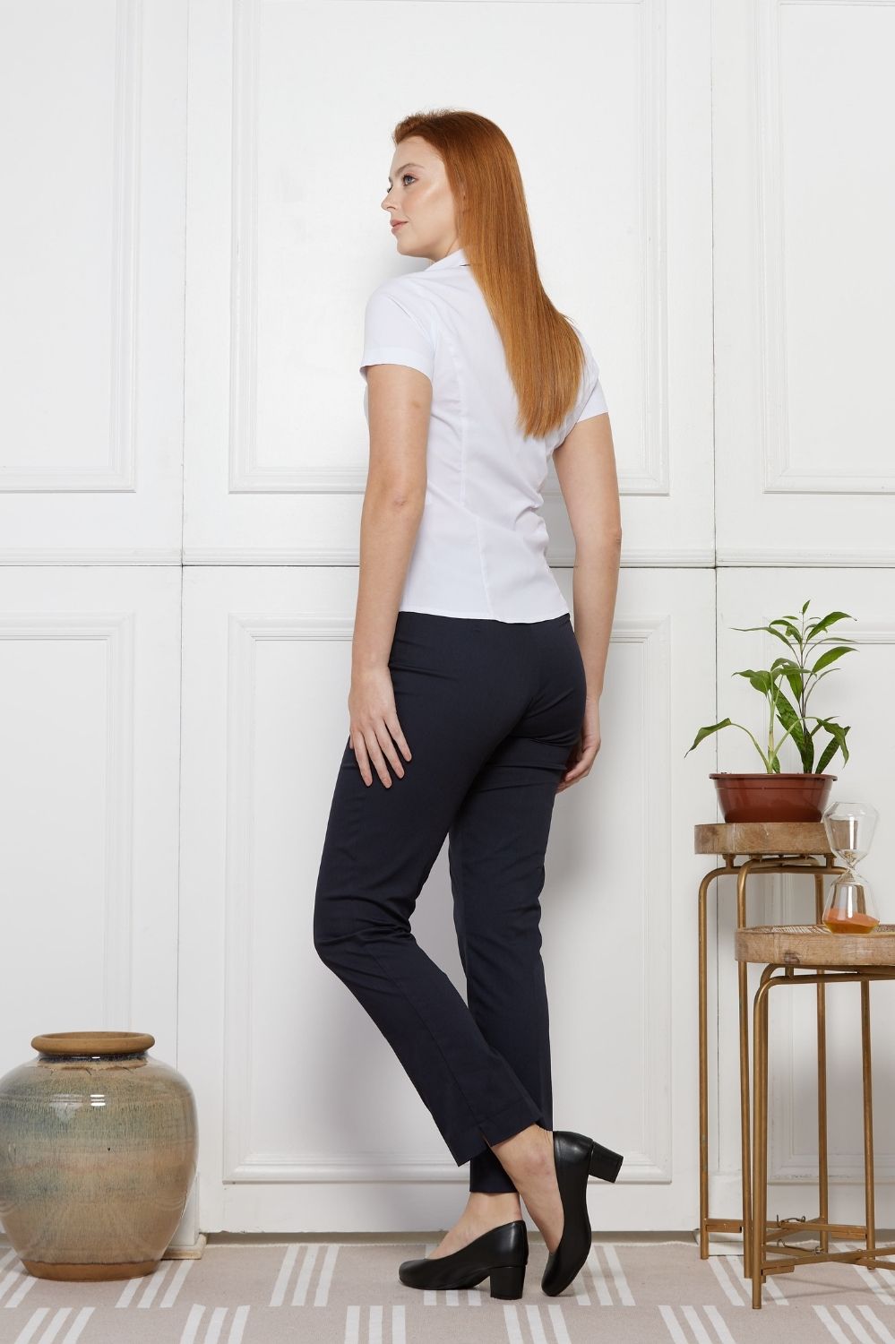 Camisa social feminina castanha tricoline com strech, manga curta, gola tradicional e detalhes no colarinho e vista em tecido seletel marinho, fechamento frontal por botões.