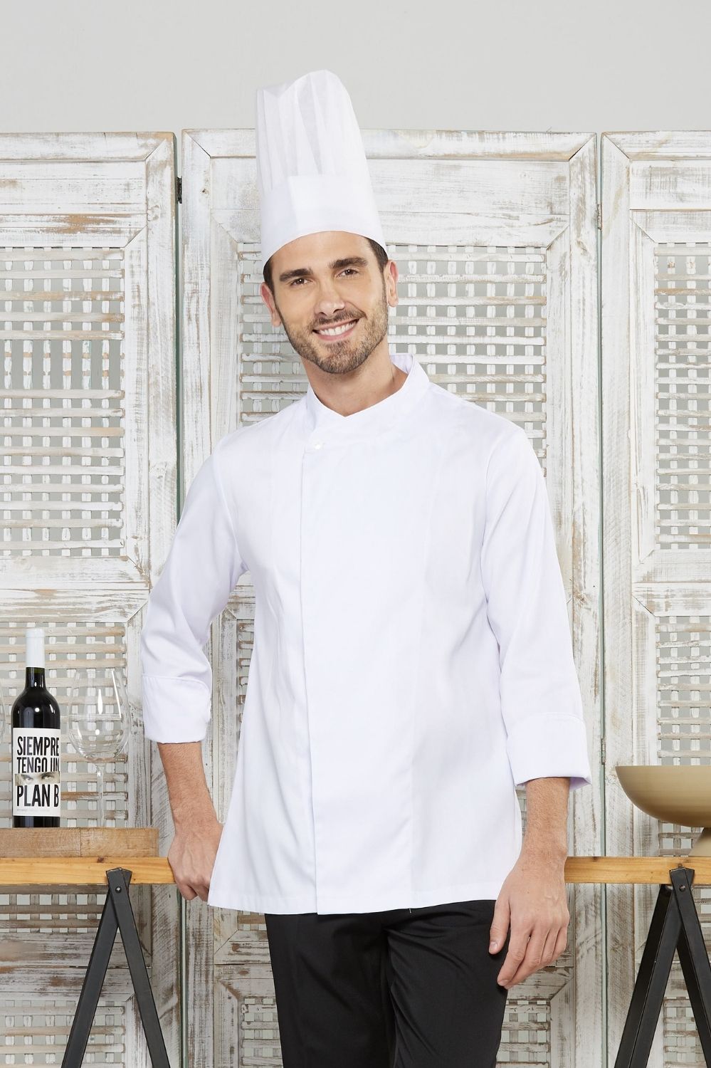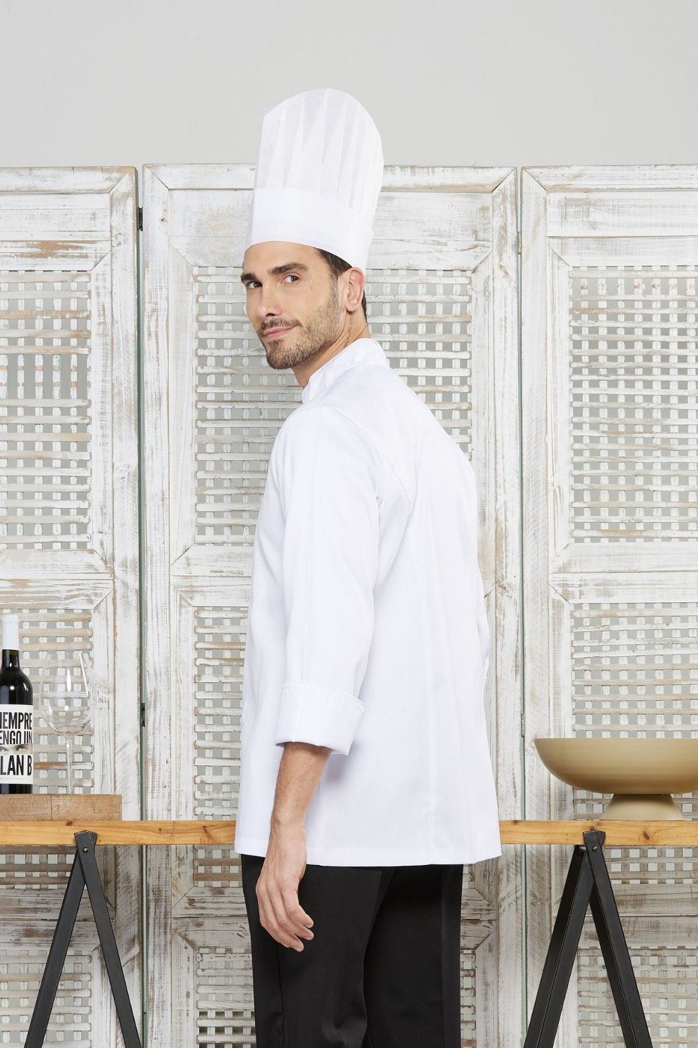 Dólmã slim Paris unissex em gabardine, fechamento transpassado com botões frontais e gola padre.